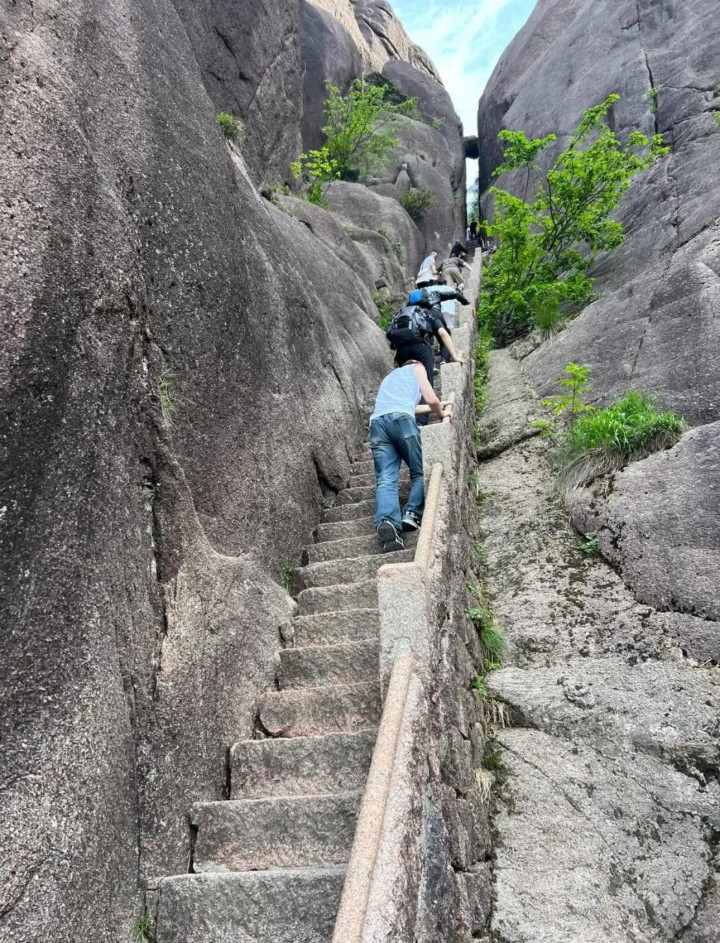 黄山的险峻藏在那些诗意的名字里——“一线天”岩壁几乎贴上鼻尖,只能容单人通过;“鲫鱼背”1米宽的小路两侧就是万丈深渊,同行的姑娘直接吓哭了。据说约30%的游客在这里选择绕行,我扶着铁链挪步时,深刻理解了什么叫“步步惊心”。