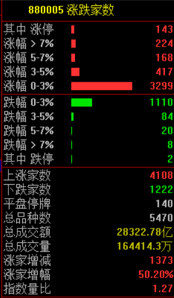 两市共4108只个股上涨,13只个股涨停,1222只个股下跌。